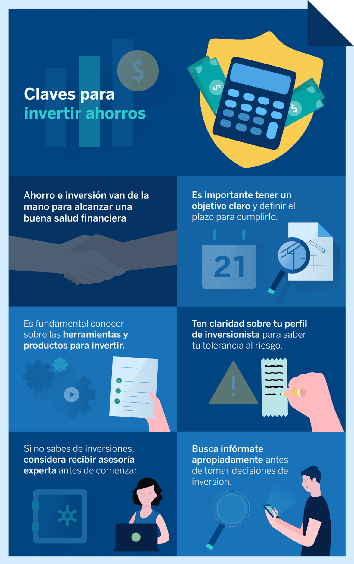 Ya conoces cómo invertir tus ahorros de forma segura. Recuerda que, el aprendizaje continuo sumado a la experiencia que vayas adquiriendo, te ayudarán a tomar mejores decisiones al invertir ahorros.