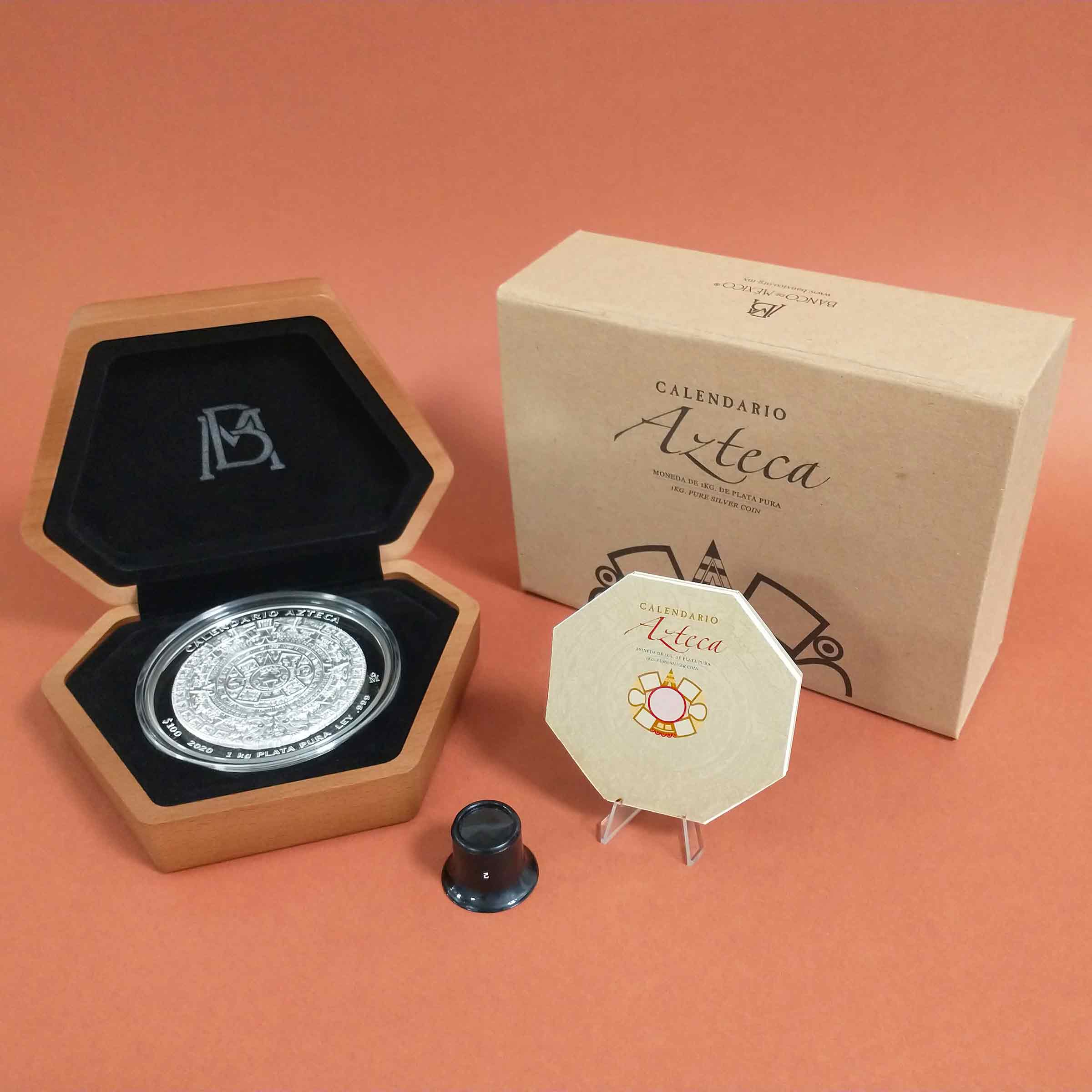 Acompañada de un estuche cuyo diseño evoca un brasero prehispánico, se incluye un certificado de autenticidad, un libro alusivo a la historia del Calendario Azteca o Piedra del Sol y una lupa para observar los finos detalles de la moneda.