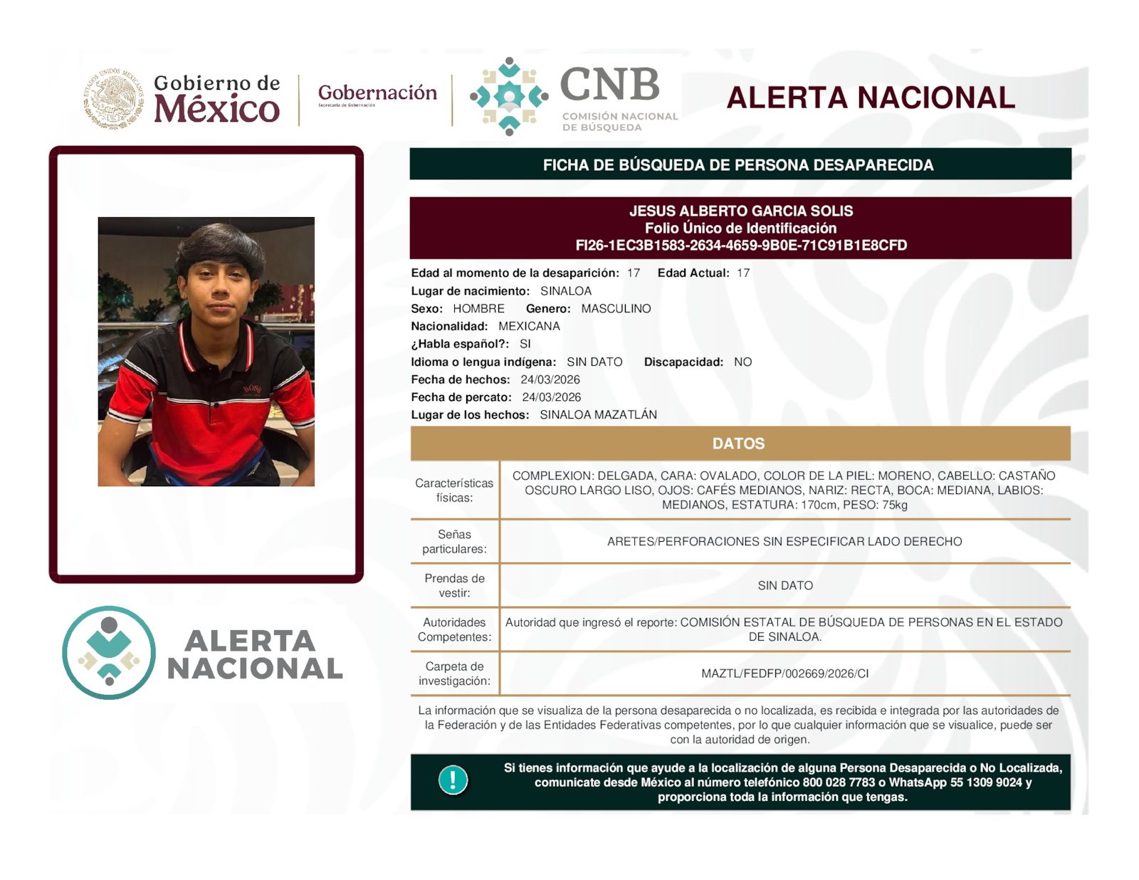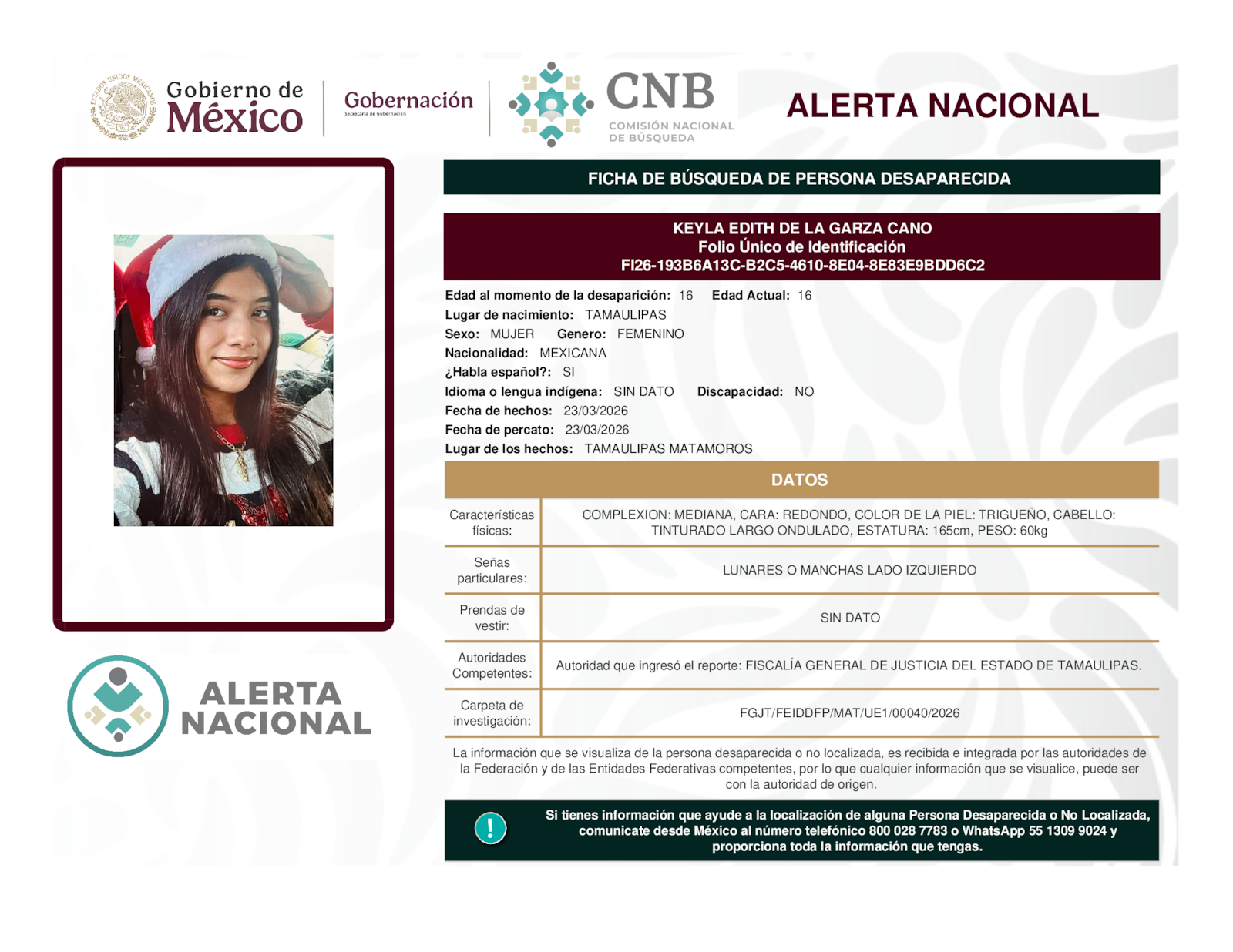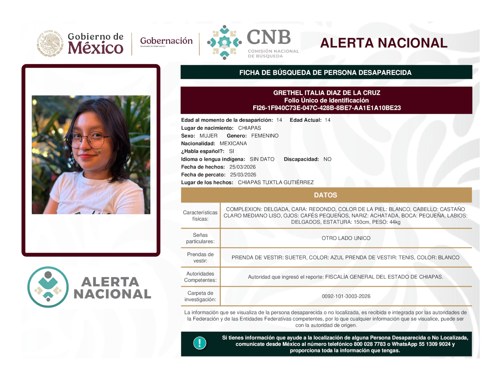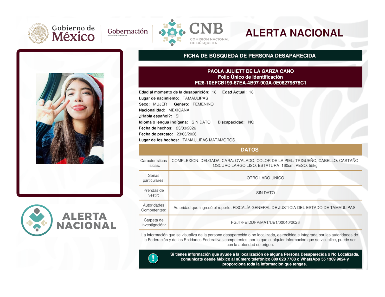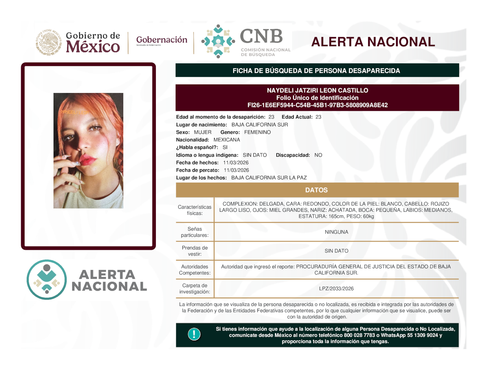 Si tienes información que ayude a la localización de alguna persona desaparecida o no localizada, comunícate desde México al número telefónico 800 028 7783 o WhatsApp 55 1309 9024