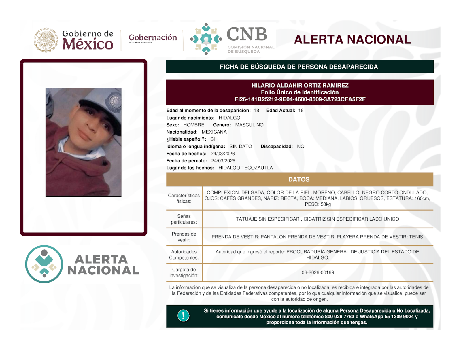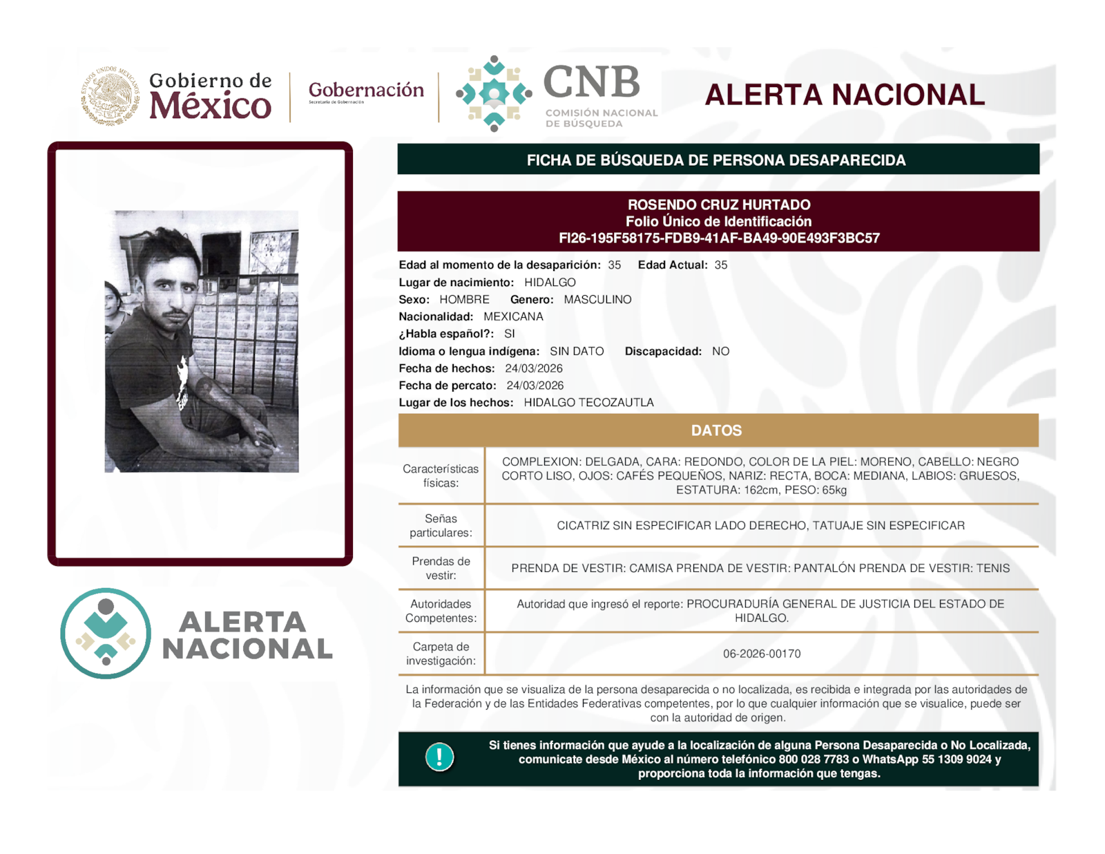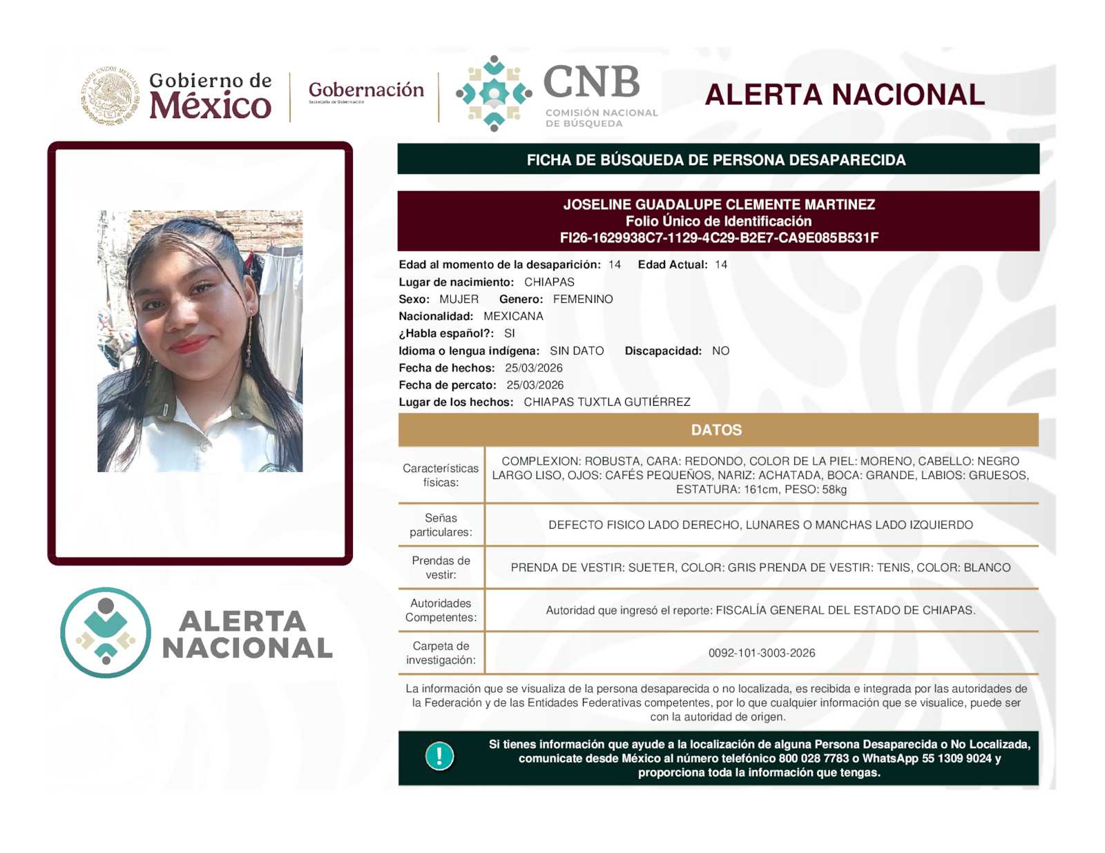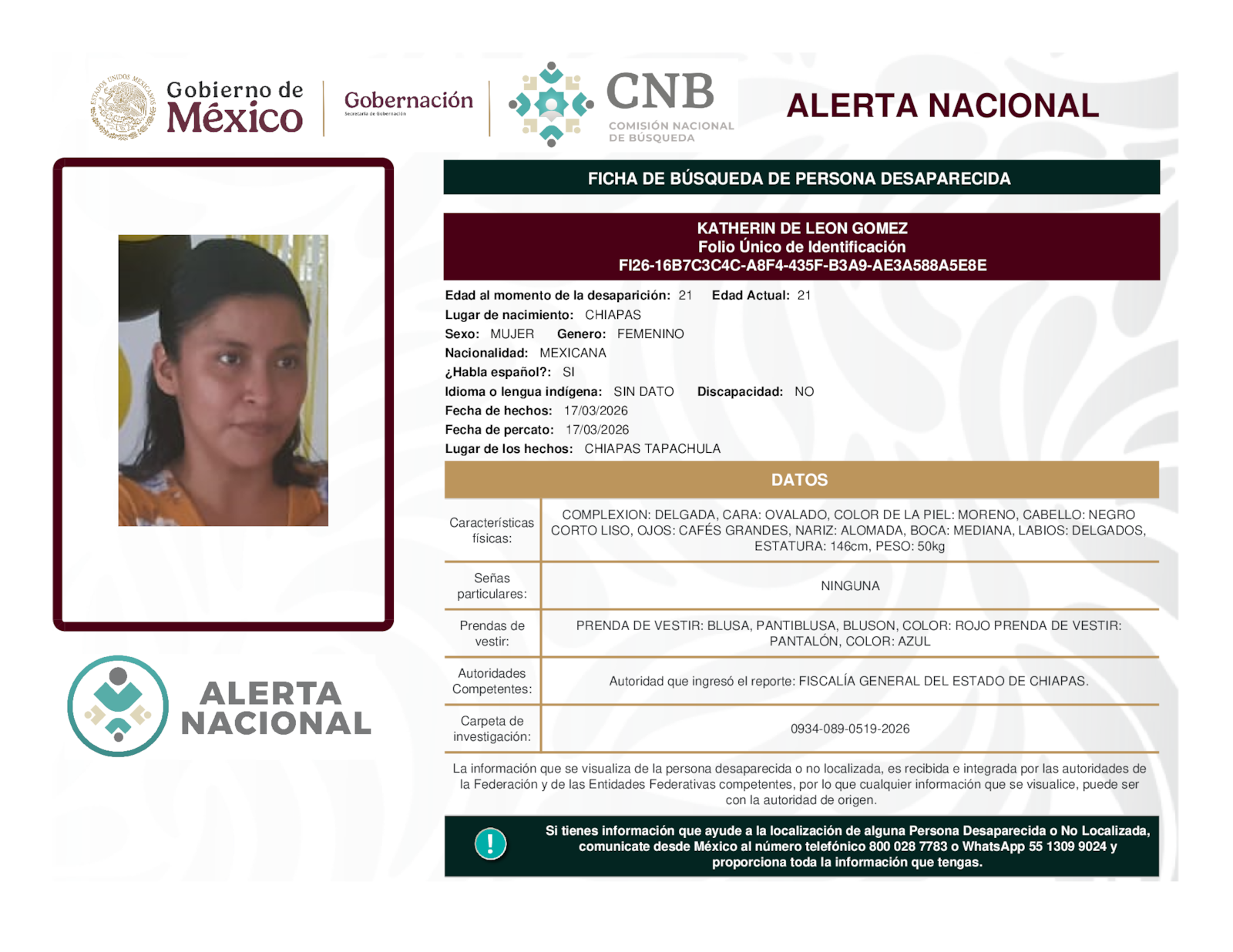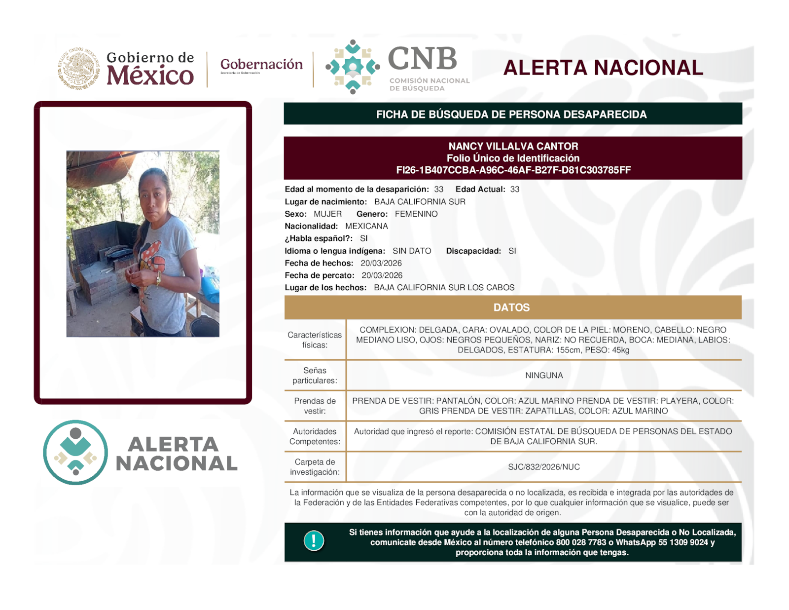 Si tienes información que ayude a la localización de alguna persona desaparecida o no localizada, comunícate desde México al número telefónico 800 028 7783 o WhatsApp 55 1309 9024