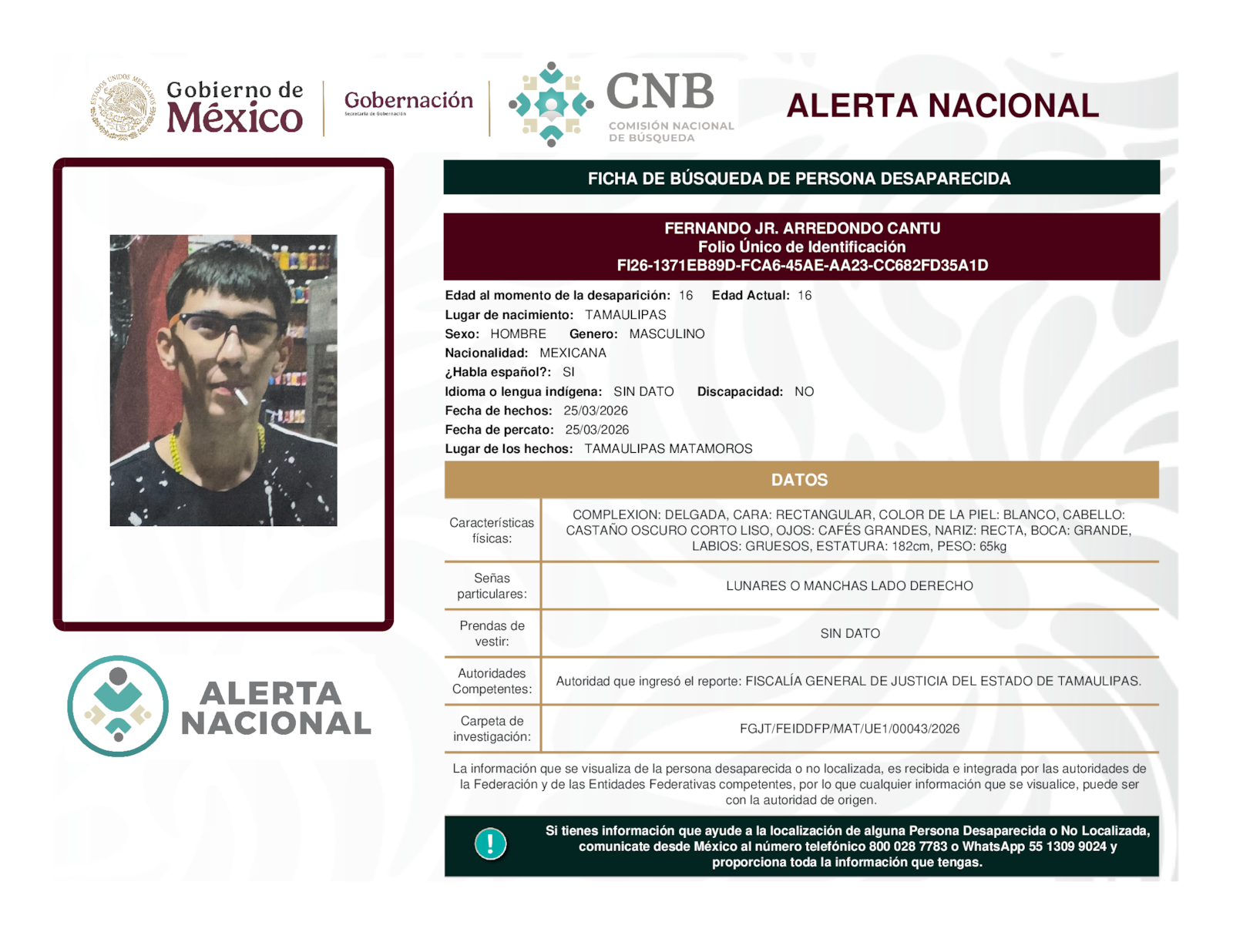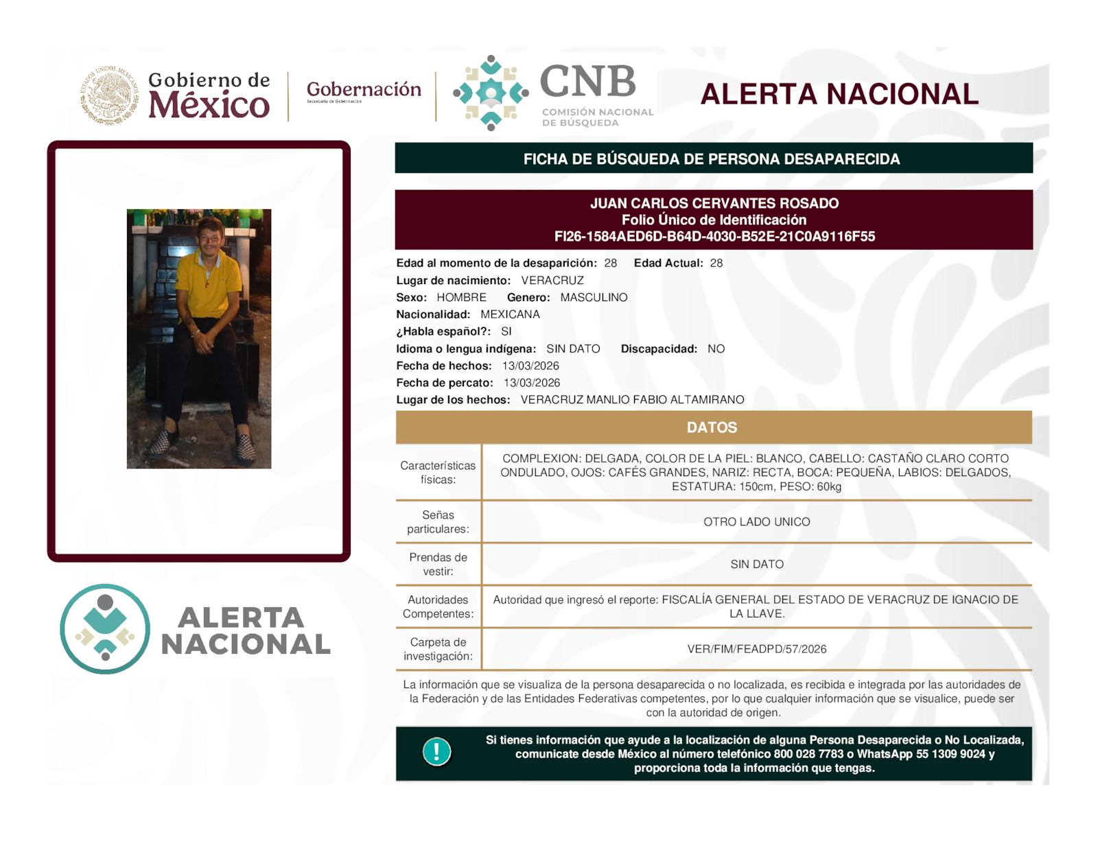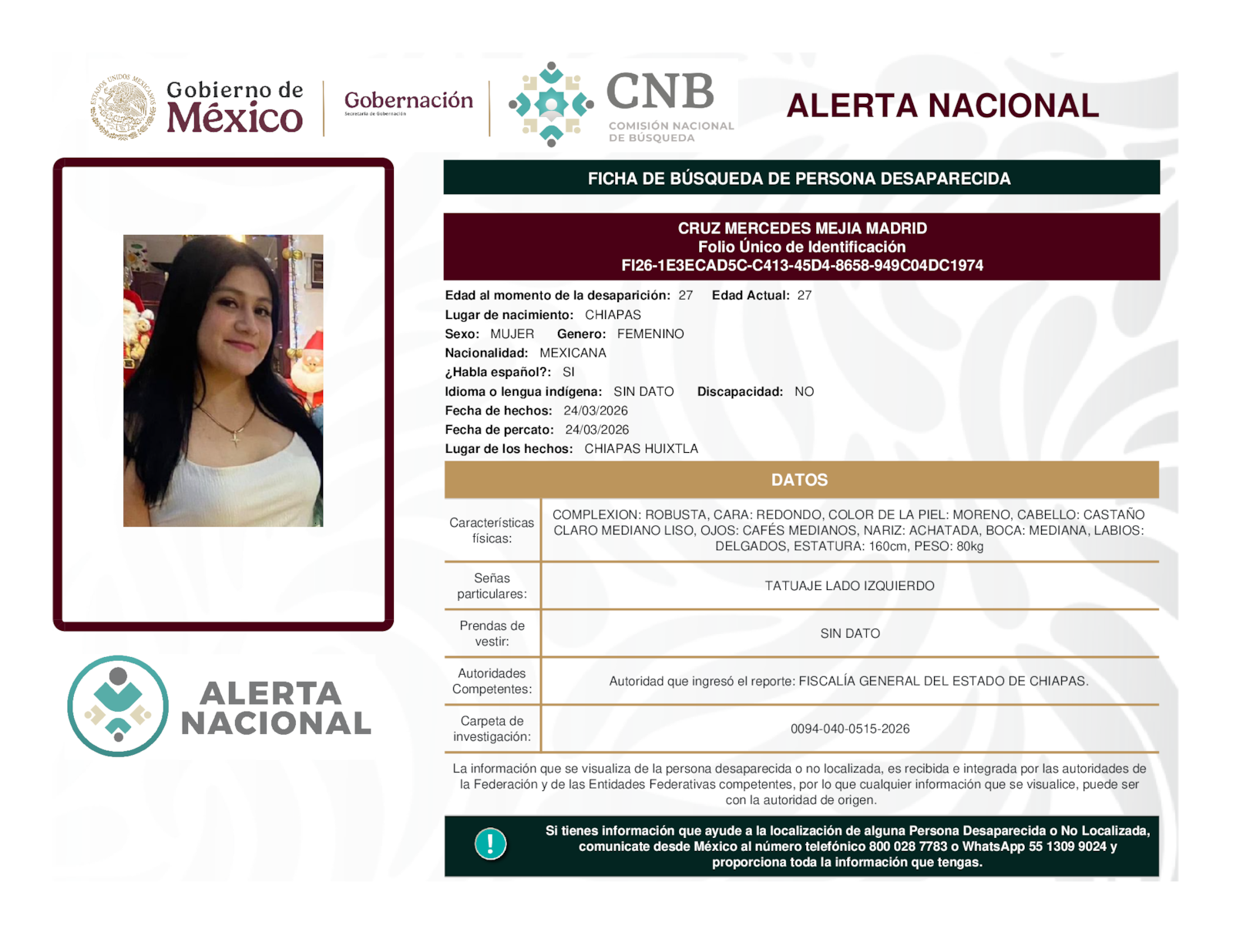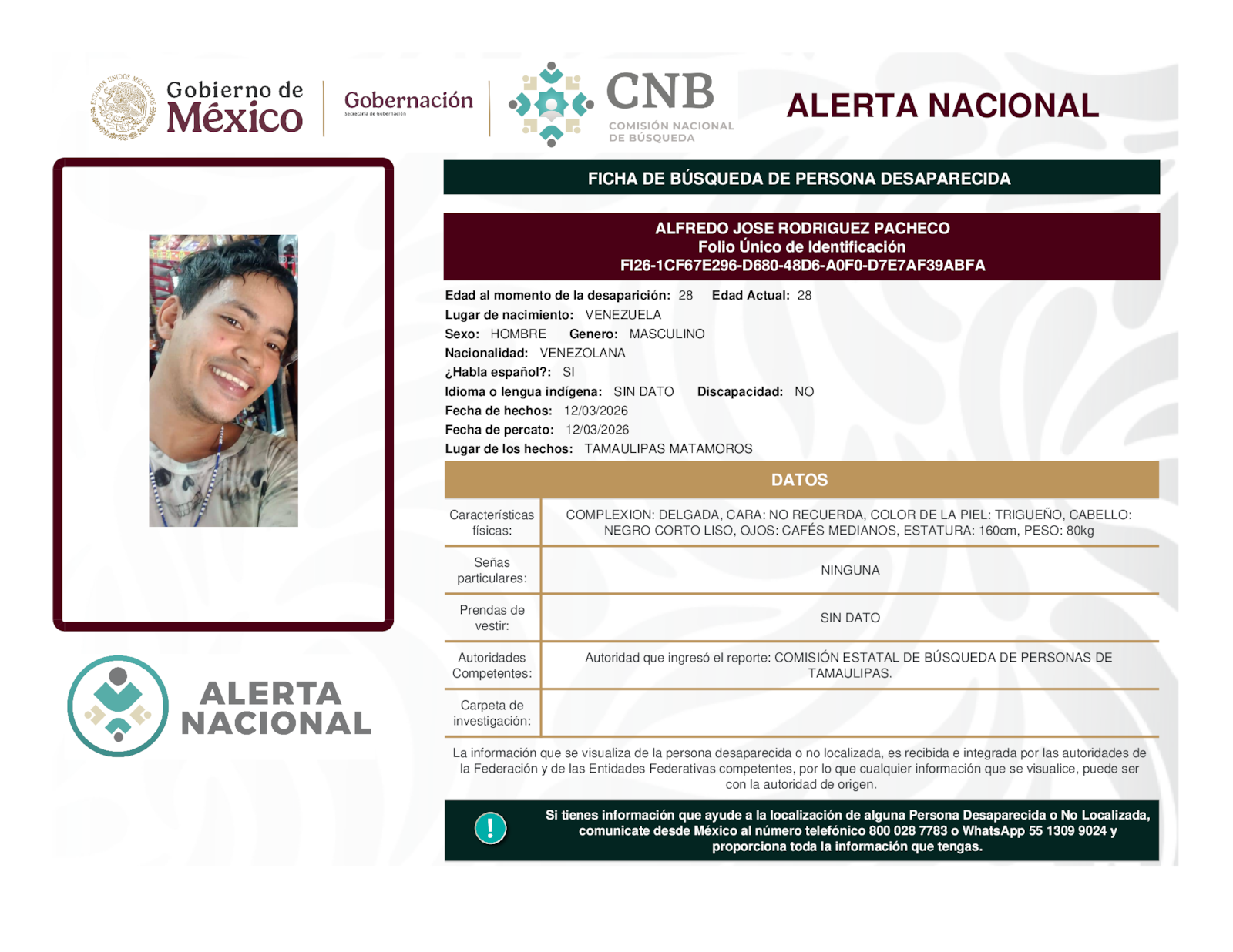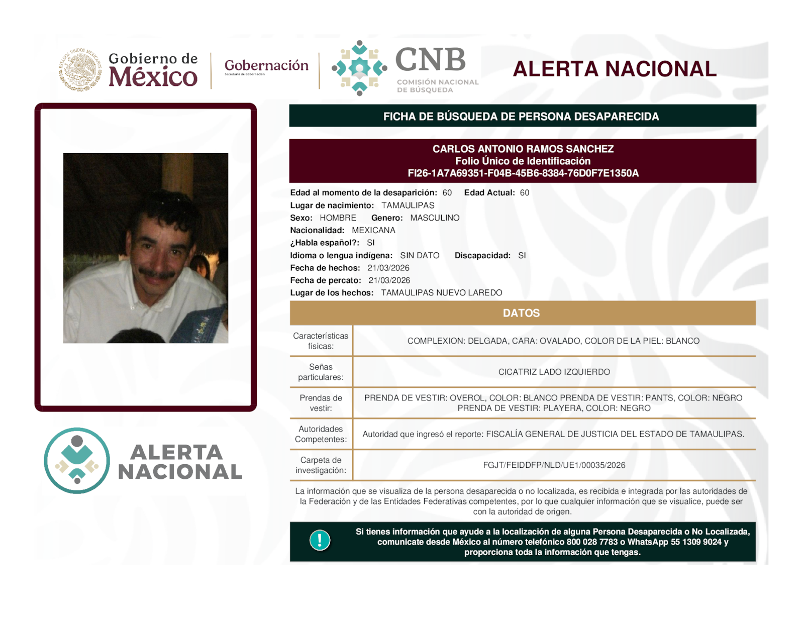 Si tienes información que ayude a la localización de alguna persona desaparecida o no localizada, comunícate desde México al número telefónico 800 028 7783 o WhatsApp 55 1309 9024