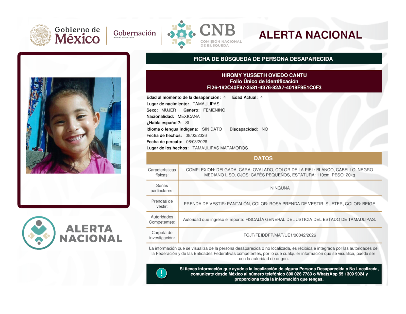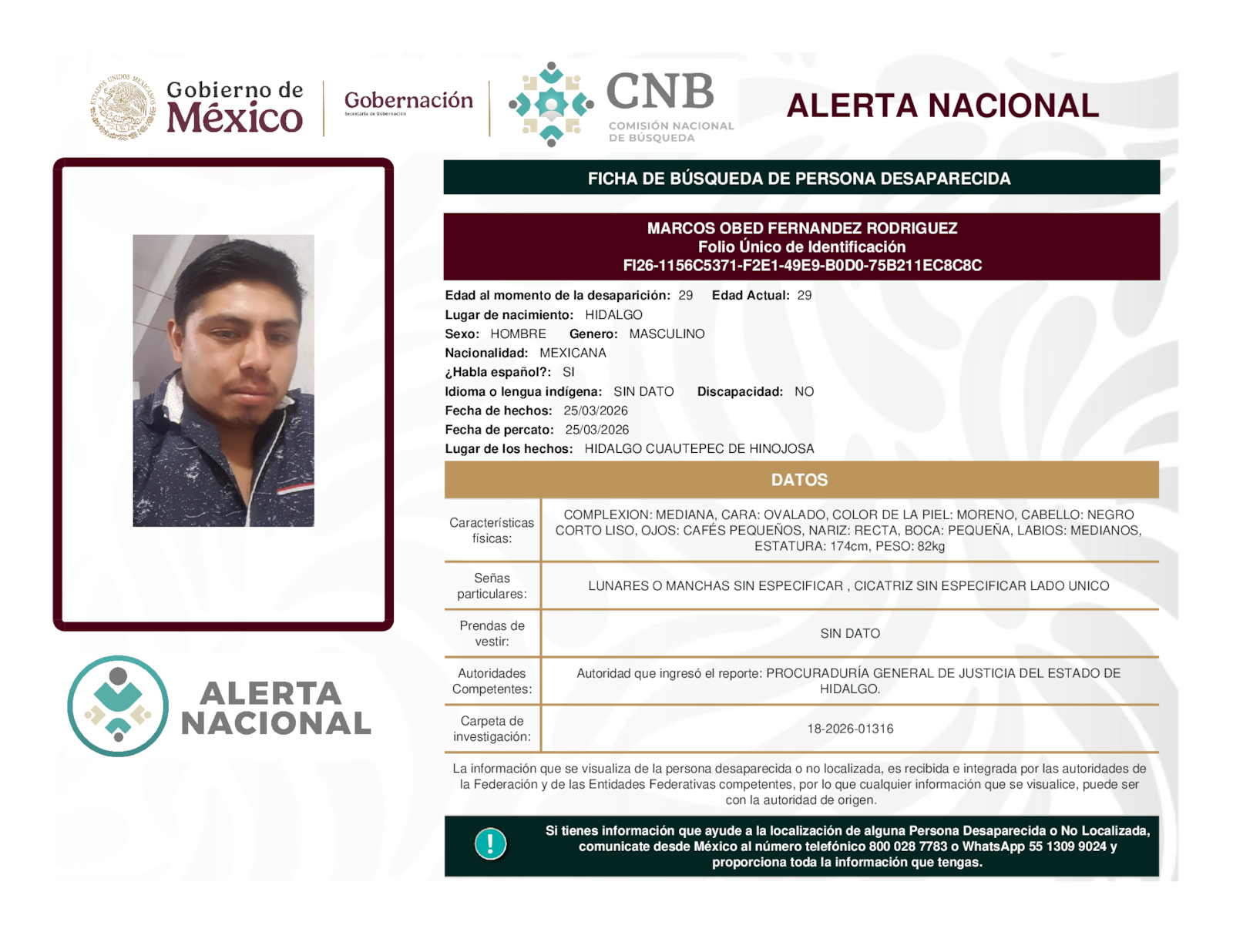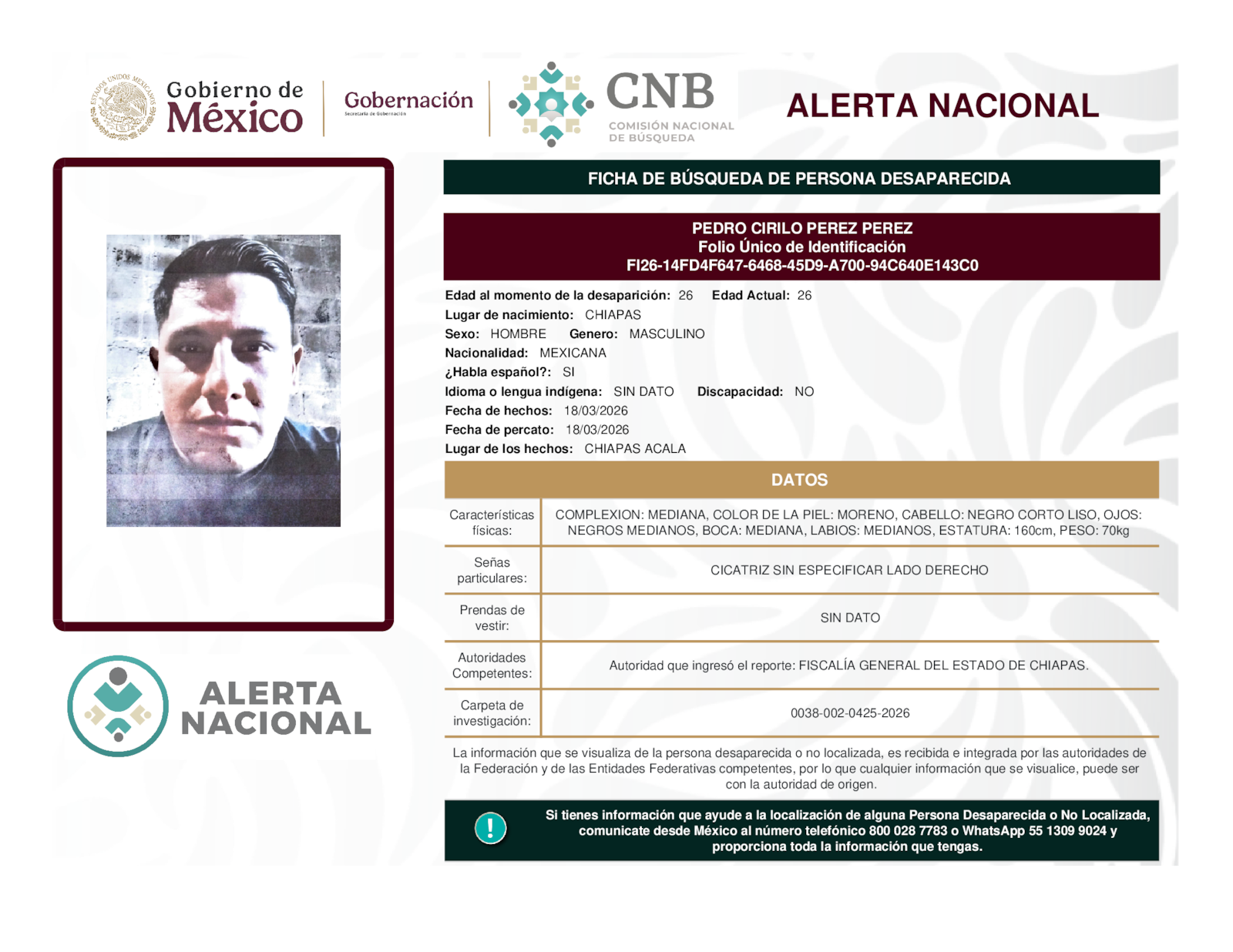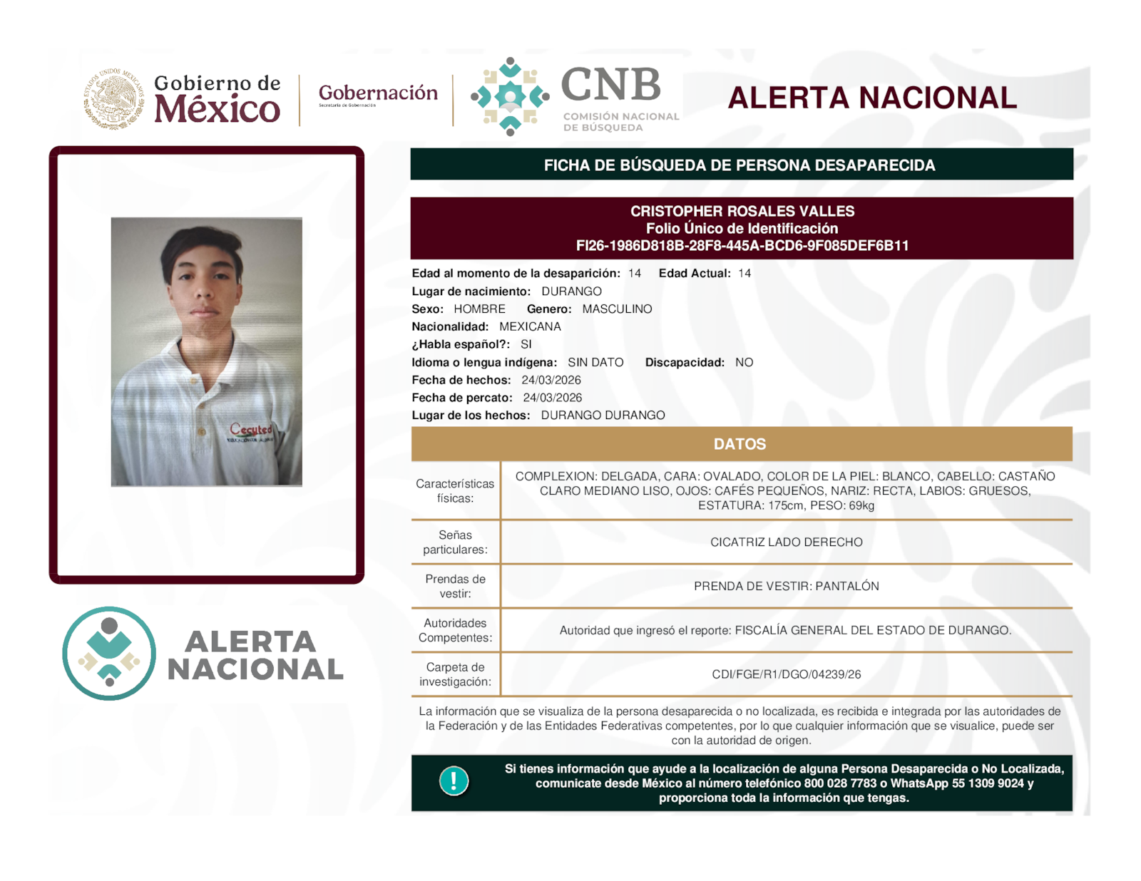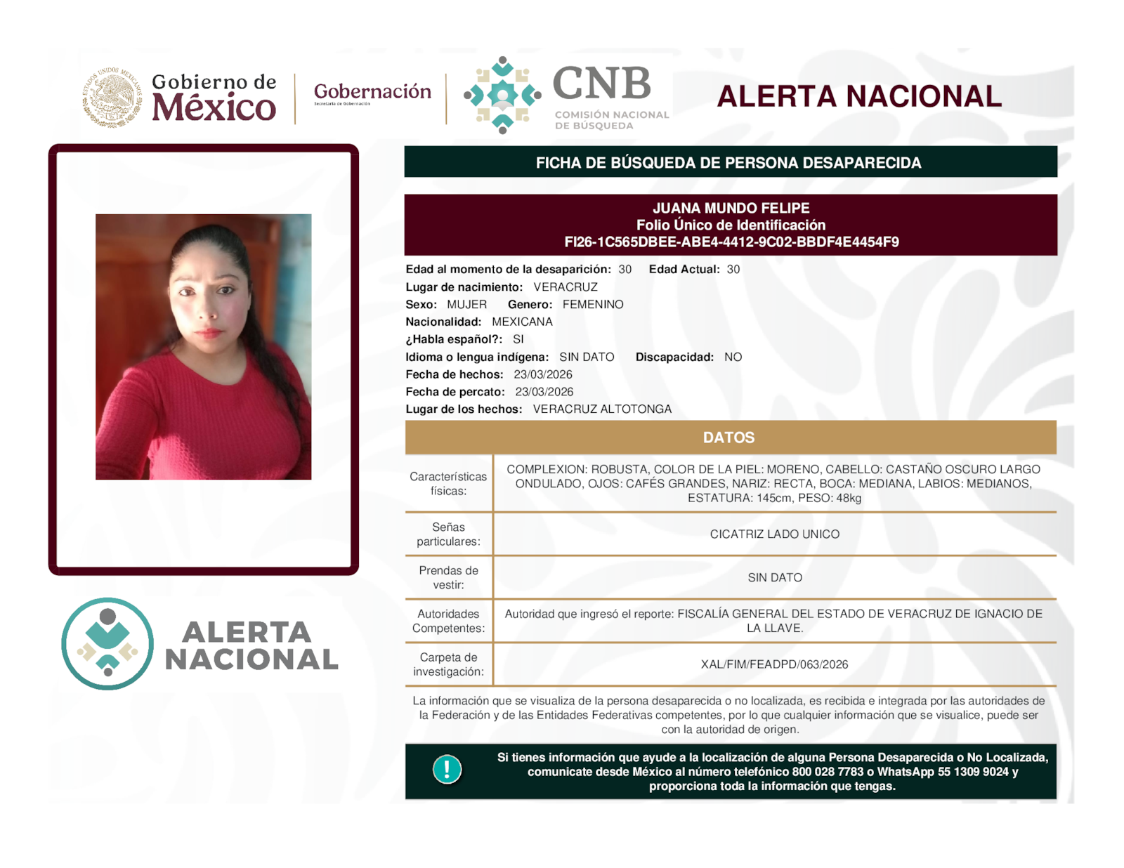 Si tienes información que ayude a la localización de alguna persona desaparecida o no localizada, comunícate desde México al número telefónico 800 028 7783 o WhatsApp 55 1309 9024
