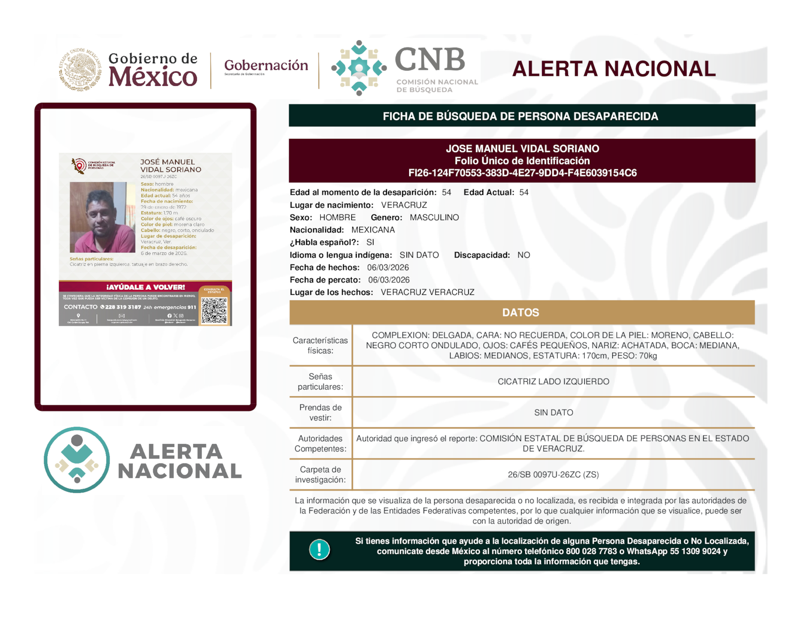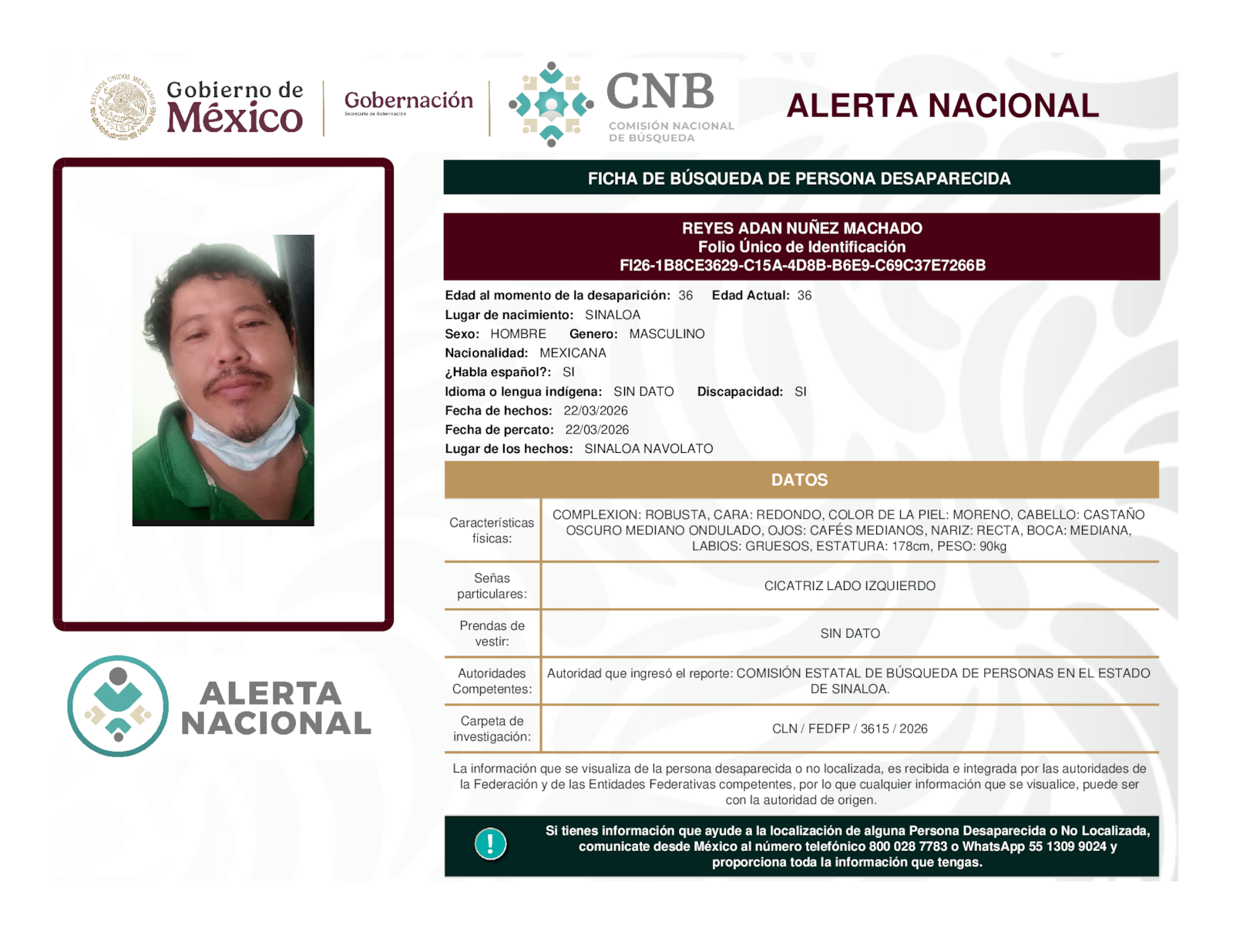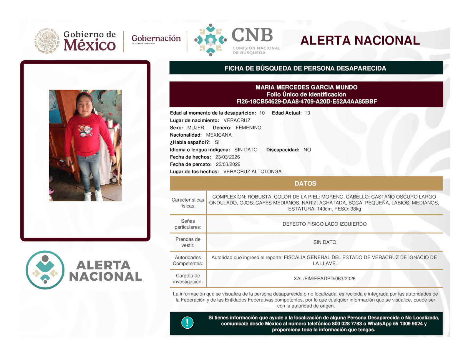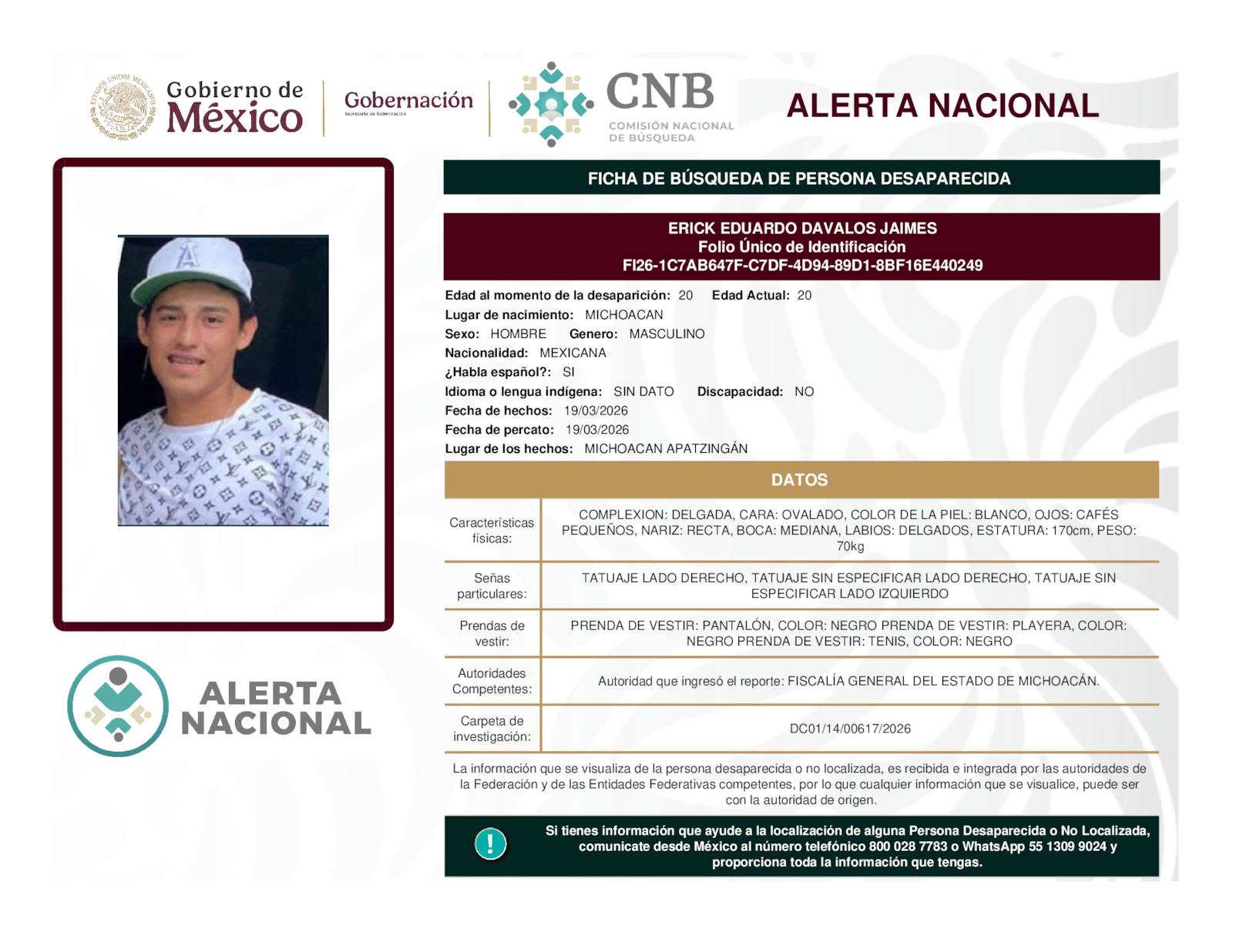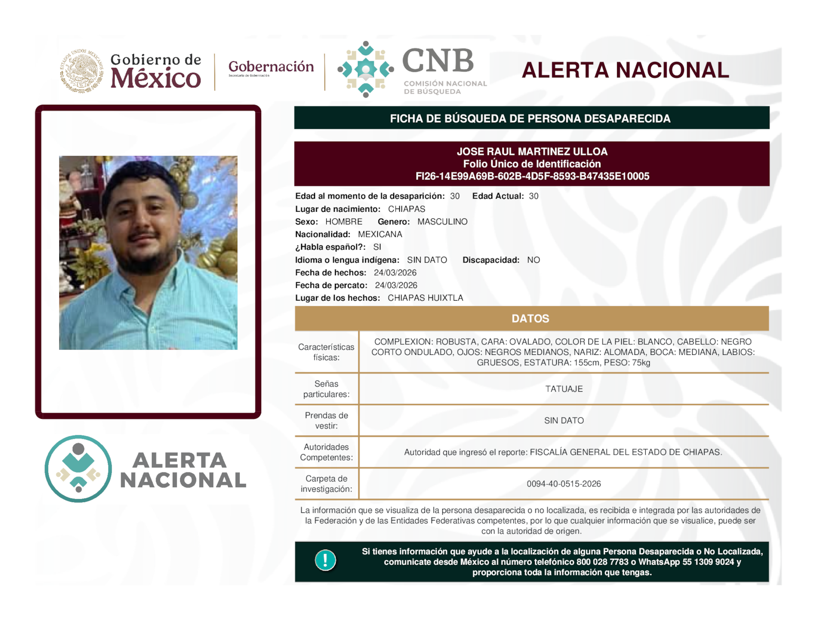 Si tienes información que ayude a la localización de alguna persona desaparecida o no localizada, comunícate desde México al número telefónico 800 028 7783 o WhatsApp 55 1309 9024