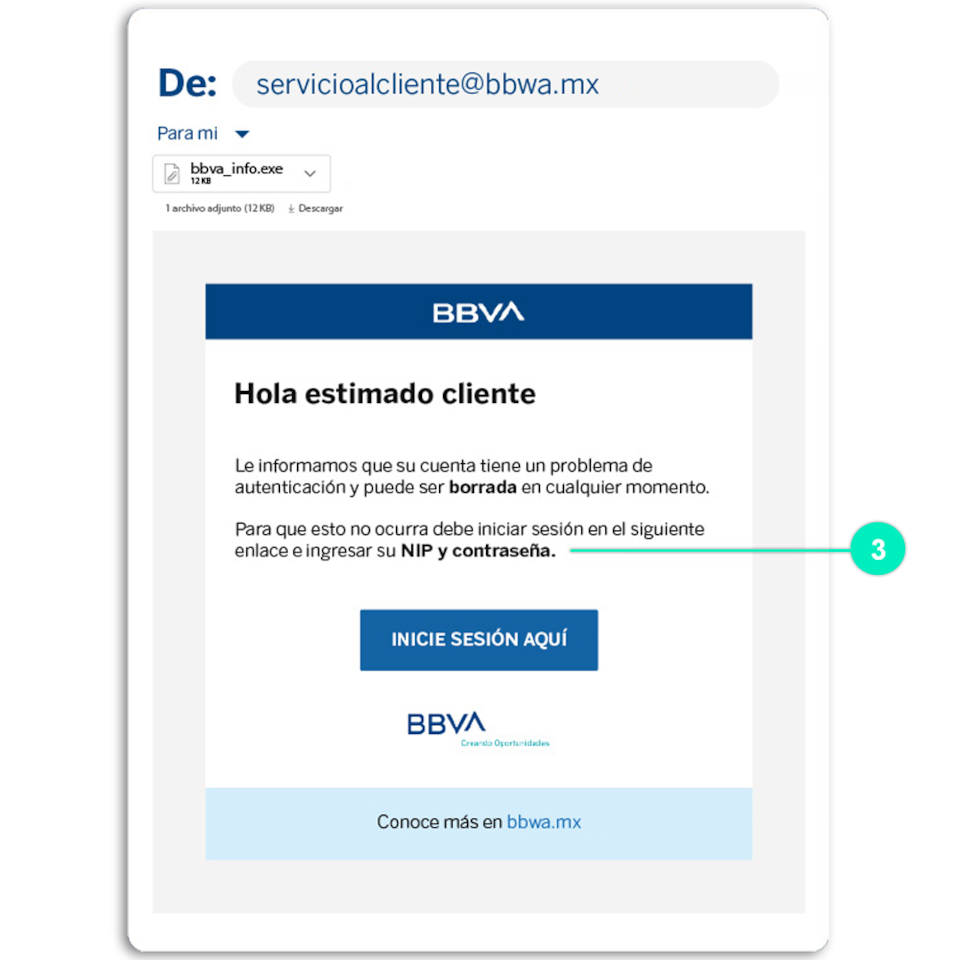 - Para evitar que entren a tu banca en línea bbva.mx, NUNCA, nunca menciones a nadie estos datos: Número de tarjeta, Contraseña de acceso o Código del Token.