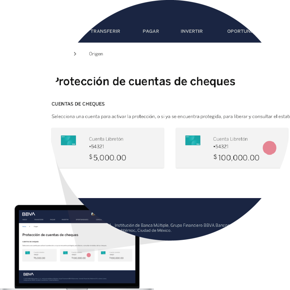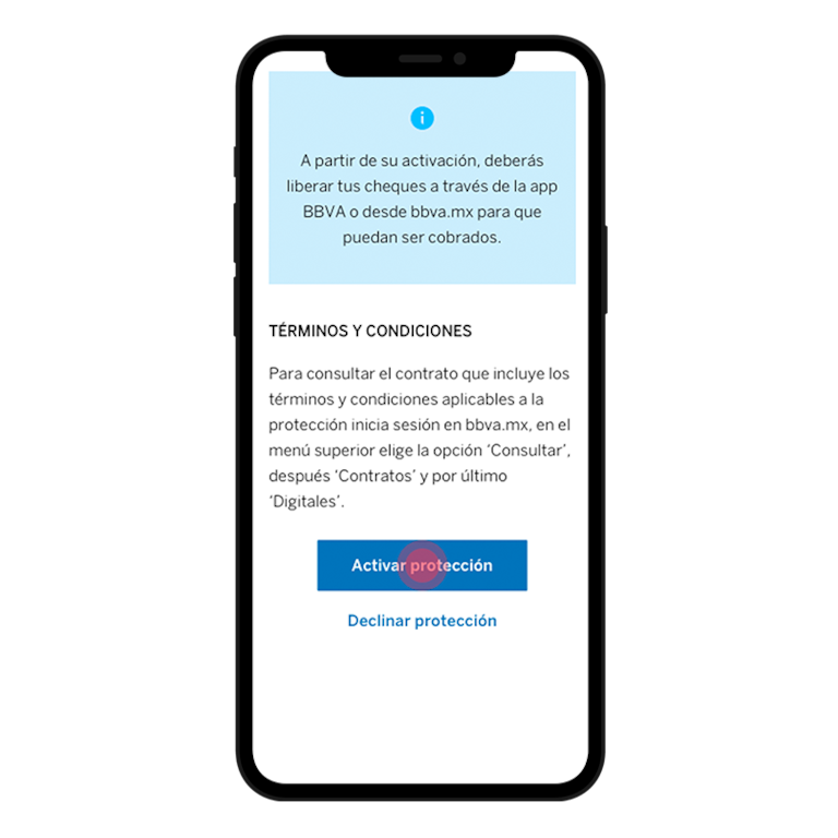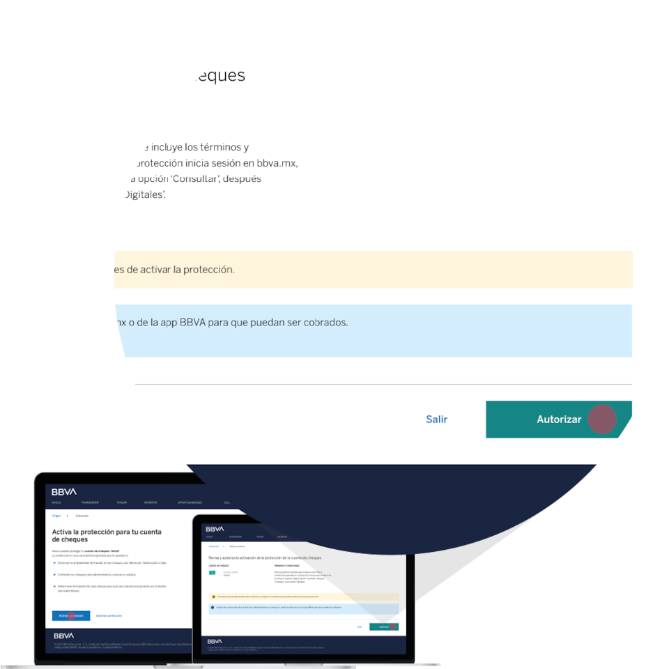 Al contratar una cuenta nueva ya tienes en automático la protección de cheques. Para cuentas Stock las puedes activar en la app BBVA y en bbva.mx