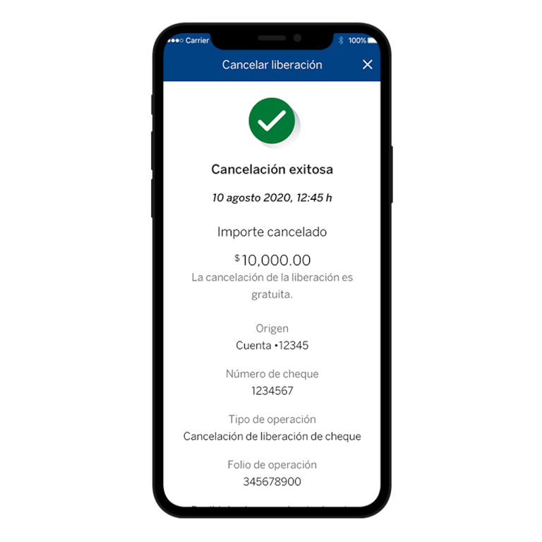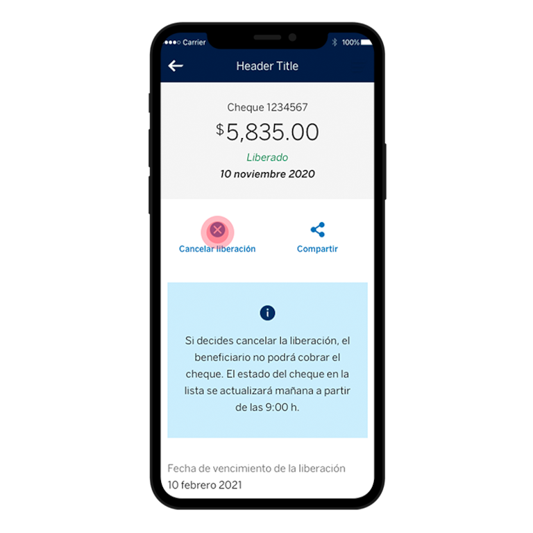 Sí, comunícate a la línea BBVA o selecciona 'Cancelación de liberación de cheques' en el detalle de tus cheques liberados en bbva.mx o desde la app BBVA.