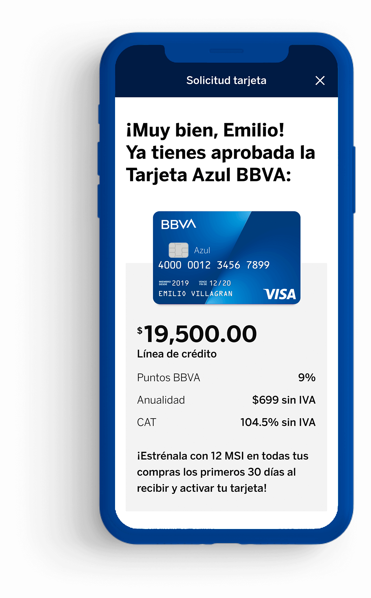² Las compras se incluirán en automático a 3 meses sin intereses siempre y cuando se realicen durante los primeros 30 días naturales a partir de la contratación de la tarjeta de crédito.Para confirmar que las compras realizadas durante los primeros 30 días a partir de la contratación y activación hayan entrado a la "Oferta de Estreno" y se difieran correctamente a 3 meses sin intereses, puedes validar que en tu estado de cuenta en máximo 4 días hábiles a partir de la fecha de compra, aparezcan las siguientes leyendas: "PROMOCION MESES S/INT" y "TRASPASO A MESES SIN INTERESES"; consúltalo a través de tu app BBVA o en bbva.mx.